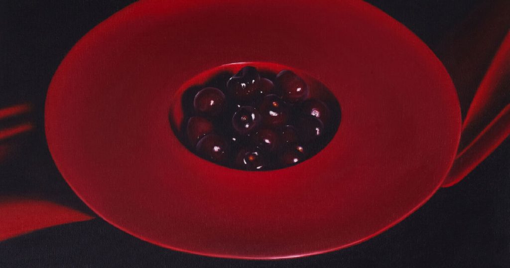 Danielle Fretwell’s oil paintings are dark and theatrical, featuring still life compositions flooded in deep shadow and sumptuous highlights. For the emerging U.S. artist’s solo show, her third at Alice Amati, she combines historical painting techniques with a photographic sheen, tapping into an eerie Lynchian surrealism. For example, a plate of bloody fruits glistens seductively in Orbital (Sweet Cherries) (2025). Her process involves pressing materials such as fabric into wet paint to create texture in her paintings, blurring the line between still image and physical object. More broadly, her work questions images’ trustworthiness amid their manipulation in the digital age when entire scenes can be created or altered using AI.
