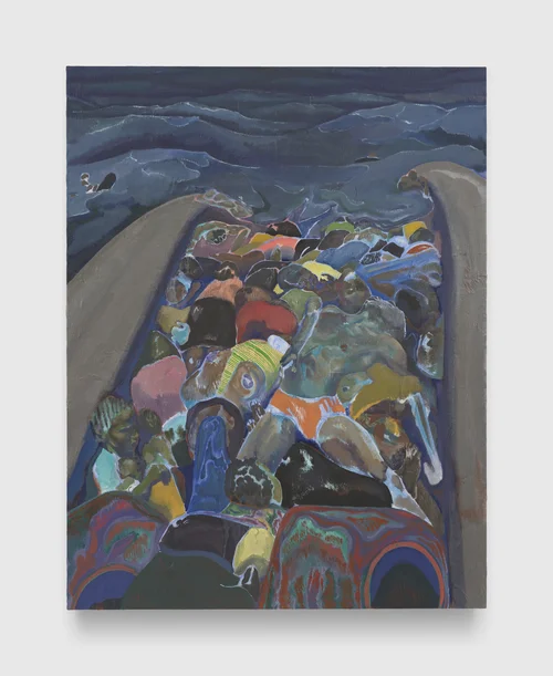 Kenyan British artist Michael Armitage’s arresting, uncompromising paintings are the subject of a major exhibition at the Pinault Collection’s second site in Venice, Palazzo Grassi. Forty-five paintings and more than 100 studies present a brutally truthful look at conflict, social upheaval, and tragedy, usually in the context of East Africa. Armitage paints with oil on Lubugo bark cloth—a deliberate rejection of the Western tradition of painting on canvas—and creates dense, sensual scenes with a vibrant, sometimes tropical, color palette. His paintings tackle hard subjects: street violence during political rallies, people drowned in migration attempts, or images from the 2020 COVID-19 lockdown. Armitage’s unique pictorial language combines the harsh reality of these daily scenes with dreamlike landscapes and abstract forms.