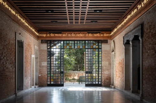 Every year, Ocean Space transforms the deconsecrated San Lorenzo church into an alternate landscape, filling the swooping space under its arches with large-scale installations, video art, and performances. This year, mounds of sand snake their way through the first hall of the church, dotted with figures made from painted shells. This is the work of Repatriates Collective, a group of artists who promote the return of cultural objects to Indigenous communities around the world. The Benin bronzes or the Elgin marbles are frequently in the news regarding questions of ownership and belonging, but we forget smaller symbols of ritual; here, the Dadikwakwa-kwa (shell dolls). An accompanying film shows Indigenous women tending these shell dolls on the dark red beaches of the Gulf of Carpentaria. Performances and soundscapes recreate this traditional ritual, in a space that straddles the contemporary and the ancient.