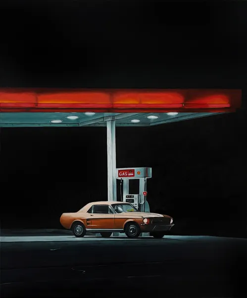 Lischka cites West Coast movies like Michael Mann’s Heat (1995) and Nicolas Winding Refn’s Drive (2011), and his canvases have the visual impact of film stills. In Mustang (2025), a gas station’s red canopy casts a harsh, artificial glow that slices through inky darkness, catching the chrome and curves of the car below. The result is high-contrast images simmering with tension, which wouldn’t look out of place in either film.