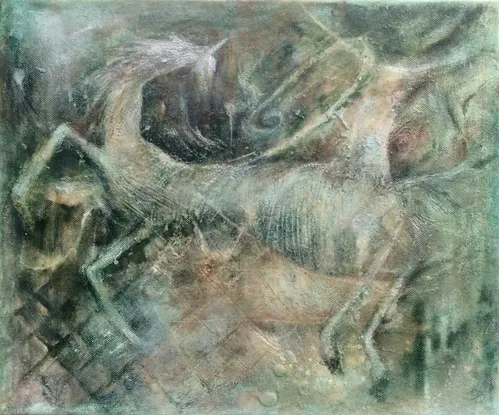 Working with pigment and oil on fabric-layered canvas, Kim builds up skin-like surfaces. The embedded fabric creates subtle ridges and valleys that catch the light of the hotel suite, creating a tactile presence. In Dancing Fossil (2026), a mythic, horse-like figure emerges from a swirl of pale pigment that cuts through a murky ground of indigo and charcoal. It’s like a ribbon of smoke, at once animated and frozen.