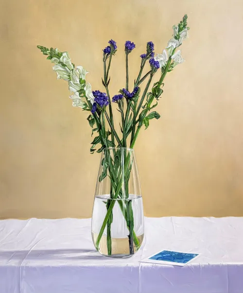 Initially trained as a mathematician, Lischka brings a rigorous compositional logic to even his quietest scenes. Le Bouquet (2025), for instance, a meticulously rendered still life of flowers in a glass vase, reveals that same exactitude, with order and atmosphere held in taut balance.