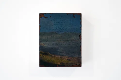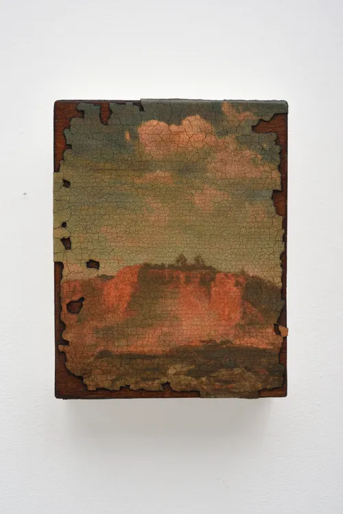 Up close, the works resemble 19th-century landscapes or Dutch still lifes salvaged from a damp basement after two centuries. Paint flakes and curls; entire passages appear to have fallen away. Yet the exposed “wood” beneath is itself meticulously painted. “Everything you see is hand-painted, and it has this very digital feel—it’s kind of uncanny,” said Chilli director Aubrey Higgin.