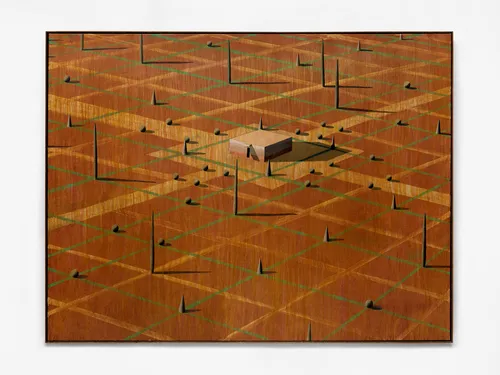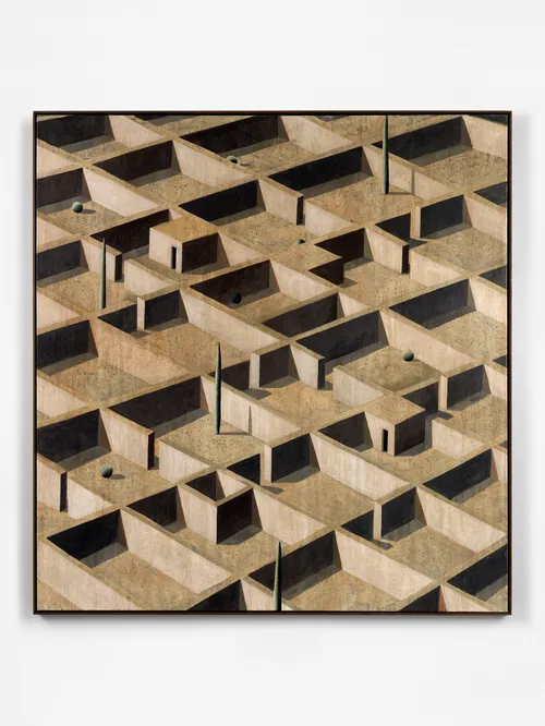 Enrich’s paintings are rendered in muted, sunstruck palettes, with late-day shadows falling across the canvas. Some works focus on a single building. PORTA 3 (2026), for example, features an entryway jutting out from a large building. The artist adds scale with a sharp, oval tree sprouting from the ground. Meanwhile, CNALB 2 (2026) zooms out into a much larger, labyrinthine structure. These dreamlike settings channel the artist’s love for urban design. “My true passion is architecture,” he said in an interview. “I’ve found a more frivolous outlet for it in painting, where I can create landscapes illuminated by two or three suns.”