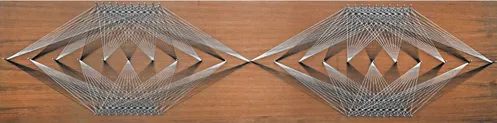 “Nailed-It” features a selection of Mehndiratta’s series by the same name, in which he meticulously places nails on teak wood panels and weaves in multicolored textiles to create hypnotic patterns. Nailed It series no. 160 (2021) is constructed around three “V”-shaped peaks, across which neon yellow, pink, green, and orange are layered together in a waveform-like pattern. Another work from the series, Nailed It series no. 180 (2025) uses grayscale fibers to create a shape that resembles contorted, battered metal sculptures.