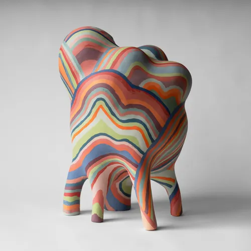 Baek handcrafts these ceramic forms using a Japanese pottery technique known as nerikomi, in which a sculpture is layered with multicolored designs to create a striated final product. Color gradients, for Baek, are a way of thinking about “natural processes.” So in Prismatic Walking Cloud (2023), a swelling, cumulus form is marked by shifting colors. In an interview with designboom, she described color gradients as symbolic to the “continuous nature of change,” understanding the “multitude of colors as potential, abundance, and vitality, and patterns as signals and communications.”