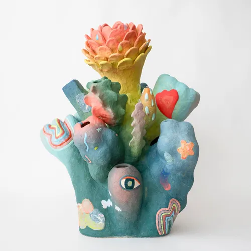 All of Janny Baek’s candy-colored ceramics look as if they were plucked from a radioactive coral reef. The sculpture Flower Power (2024), for instance, is a bulbous form that evokes some hybrid organism with an undulating blue surface. Decorated with a protruding eye and a red heart, this playful—and disturbing—form suggests organic mutations. This work is part of Baek’s debut solo show at Joy Machine in Chicago.