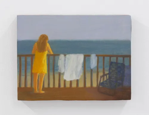 Chicago-based artist Kayla Risko focuses on the fleeting moments of the day in her paintings, where figures appear lost in thought. Late Afternoon, July (2026), for instance, shows a girl in a yellow dress staring out into the ocean. Likewise, Brazilian artist Adriel Visoto treats painting as a way to archive his life, documenting overlooked moments from the day-to-day. One work in the show, Little nap II (from the series: Sunday blues) (2023), features a sleeping dog rendered in soft blue tones. Meanwhile, Mexican artist Sebastián Hidalgo explores dreamy, uncanny ideas in works like Gatos y fotones (Cats and Photons) (2026), which features two floating cats suspended among balls of energy.