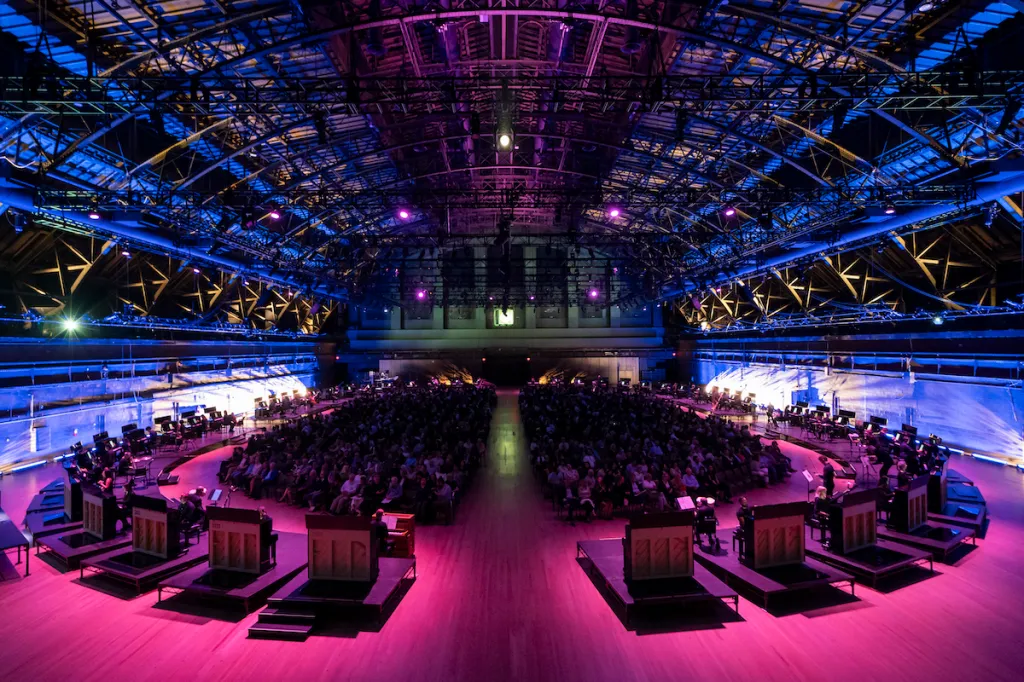 In New York’s Park Avenue Armory, an ambitious series of performances that commenced last night and continues through October 7 marks the North American premiere of 11,000 Strings, an orchestral piece by composer Georg Friedrich Haas that features 50 black pianos arranged in a ring. The lighting is understated, subtle yet spacey enough to evoke a different kind of atmosphere while showcasing the Armory Drill Hall’s overwhelming 55,000-square-foot expanse. That makes the sound the star of the show—and a lot of sound, to be sure.