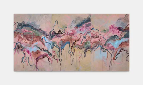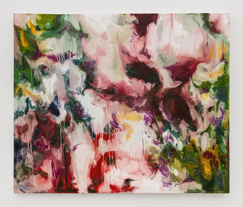In Forever After Days (2025), a large oil painting, for example, blush pinks and milky whites open the canvas up, while deep reds pool and descend. Forms hover at the edge of recognition—petals, foliage, perhaps bodily contours. Soft areas of paint contrast with dragged, layered passages that leave ridges and drips, registering the pressure of the hand and inviting the eye to wander.