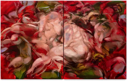 Emerging artist Eleanor Johnson’s large-scale paintings use a layered, kinetic process, as vivid corporeal forms shift and recombine across the surface. Drawing on Baroque painting, particularly the tumbling compositions of Peter Paul Rubens, she brings a sense of movement while reconsidering the body through a contemporary perspective on gender and perception.