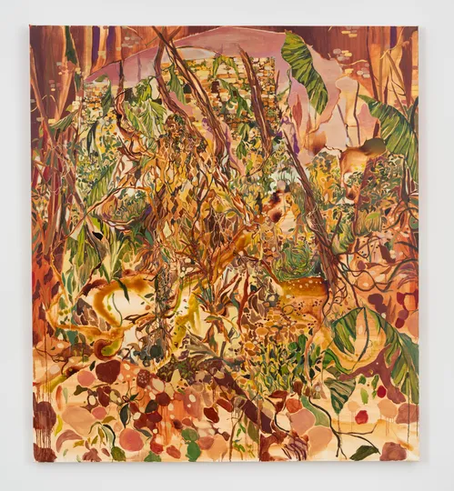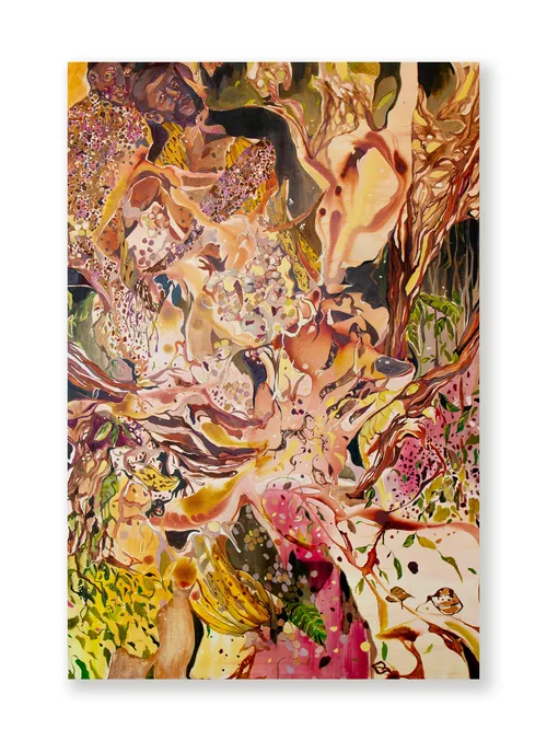 Finéus’s paintings reference her Haitian heritage through layered landscapes. In Memory as Fortress, Roots as Pathway (2025), a kaleidoscopic field emerges with ambiguous figures that evoke vegetal forms. Interlocking branches bind bodies to the painting’s background—which, according to the artist, evoke spirits of Haitian Vodou.