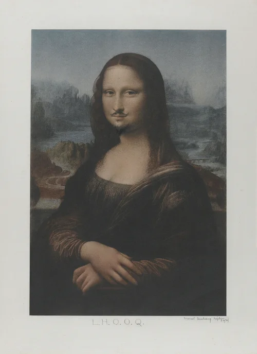 In 1919, marking the 400th anniversary of Leonardo da Vinci’s death, Duchamp drew a mustache and goatee on a postcard reproduction of Mona Lisa and titled it L.H.O.O.Q. Read aloud in French, the letters roughly translate to “she has a hot ass.” The work was both a prank and a Dadaist provocation, mocking conventional notions of gender, the sanctity of art history, and the fetishization of beauty.