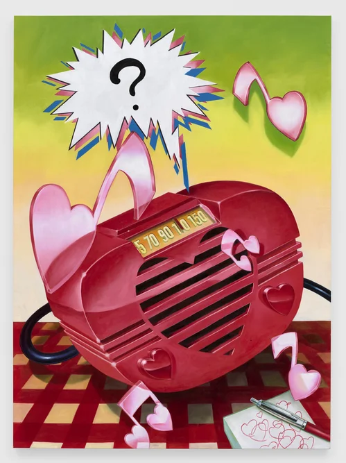Growing up in New Jersey as the daughter of commercial silkscreen printers, Jamian Juliano-Villani spent her childhood folding identical t-shirts emblazoned with familiar images like Pope John Paul II’s face. That early exposure to mass reproduction still animates her painting practice, which culls imagery from memes, film stills, stock photo databases, children’s books, art history, and the continuous scroll of contemporary visual culture, then recombines it in operatically bizarre compositions.