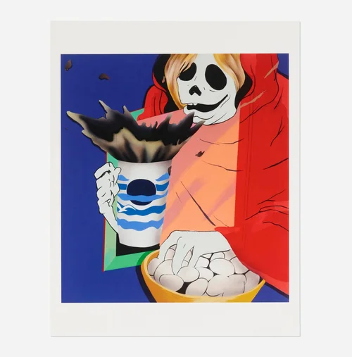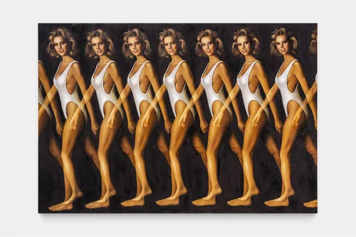 Likewise, the artist has outsourced her canvases to reproduction painters in China, making works she described as “human AI.” For example, Ashley (2024) features repeated images of Jean-Michel Basquiat kicking a chair.