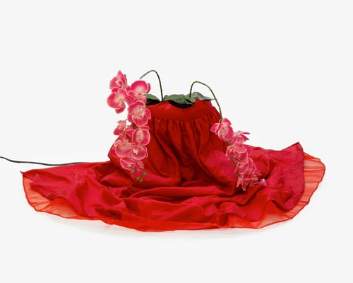 Duchamp had an uncanny talent for making ordinary objects feel erotic, even perverse. Many of his later works explicitly conjured body parts, from Please Touch (1947), with its three-dimensional rubber breast set against black velvet, to Female Fig Leaf (1950), a bronze cast reminiscent of female genitalia held within a leaf. Youn extends that subversive sensibility through kinetic sculptures built from salvaged massagers, fans, motors, exercise bikes, and artificial flowers that twitch, bow, and strain in awkward, repetitive motions. In Tantal (2026), a diminutive neck massager rotates two red orchids bound together by a thin silver chain, while in Sit Pretty (2024), two overburdened orchid plants shake and gyrate atop a vibration platform draped in a lush crimson hanbok chima, or a traditional Korean skirt.