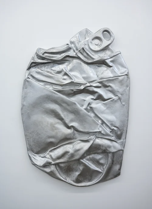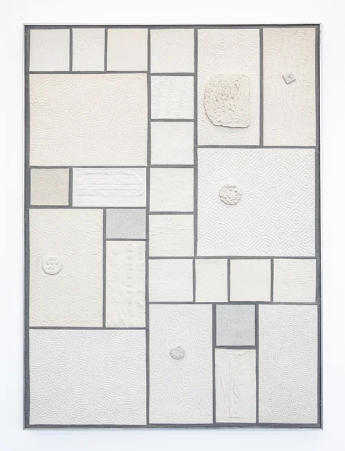 These interventions don’t obscure the original objects so much as reframe them, revealing their latent value and restoring a sense of beauty to the overlooked and cast-off. Absorption Panel (White Bread) (2024), for example, features a patchwork of various paper towel and napkin patterns rendered in white, cream, and ecru ceramic mounted on mortar and enclosed in a metal frame. A Ritz cracker and a slice of white bread lend the deceptively elegant relief a sense of playfulness.