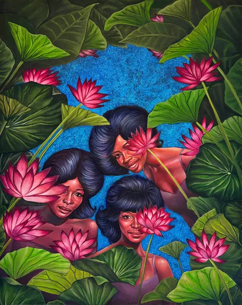 “In Aludria” marks emerging artist Lanise Howard’s third solo exhibition with Miami’s Mindy Solomon Gallery. The artist presents oil paintings alongside mixed-media gouache and colored pencil drawings. These deftly rendered pieces use saturated reds, blues, and yellows to “[create] an analogous world where hidden histories, personal allegories, and multiple periods of time merge,” as Howard said in the exhibition’s press text.