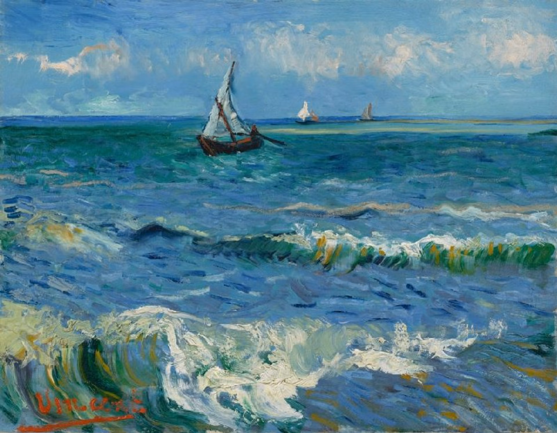Van Gogh’s style in June 1888, when he visited the fishing port, can be seen in the authentic painting Seascape near Les Sainte-Maries-de-la-Mer, now at Amsterdam’s Van Gogh Museum. A few grains of sand embedded in the paint confirm that this work was painted on the beach.