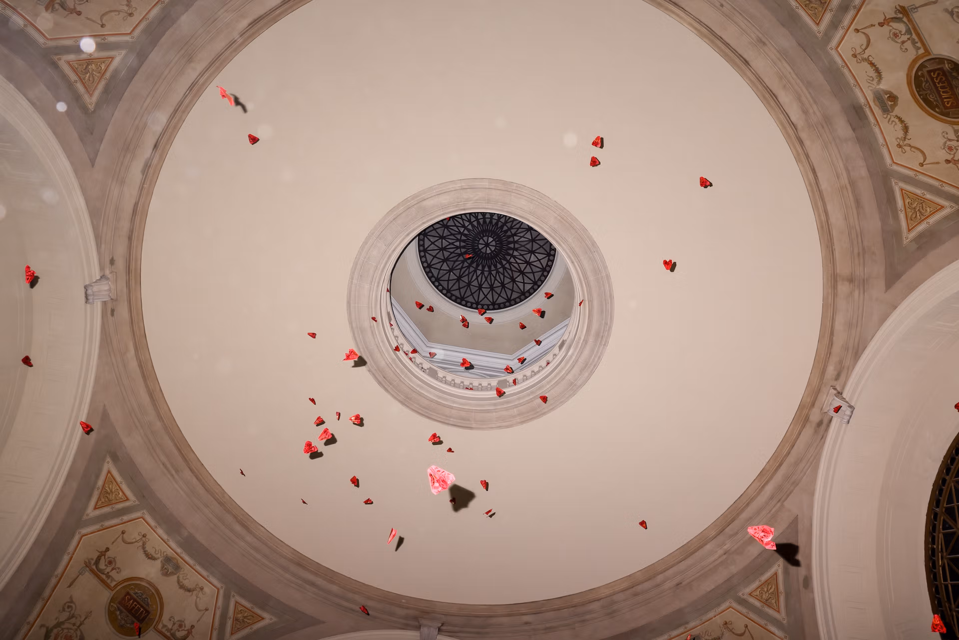 The planes were designed to resemble hongbao, the red envelopes containing money traditionally exchanged during Chinese New Year to symbolise good luck and prosperity—an especially appropriate allusion inside a former bank. When unfolded, each envelope revealed a single word drawn from 5,000 of the most commonly used nouns in the English language.