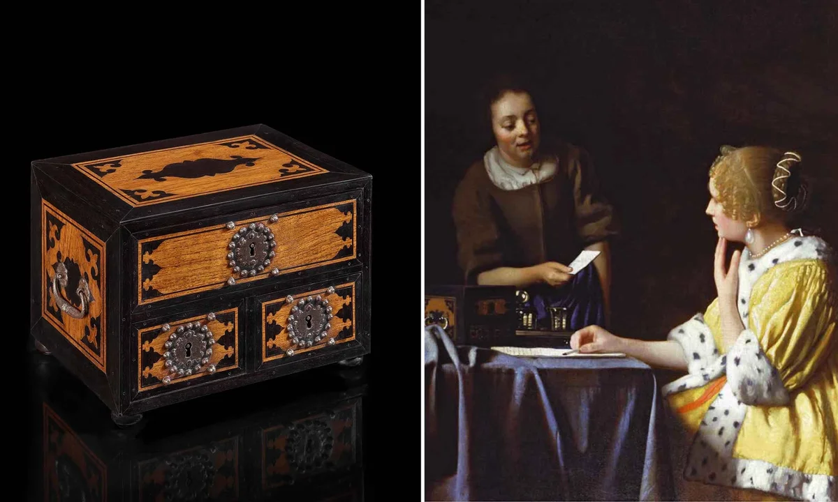 These types of caskets would have been very expensive in 17th-century Holland and it is almost inconceivable that Vermeer could have afforded one. Yet he has accurately depicted a casket in the two paintings, which means that he presumably had an example in his studio.