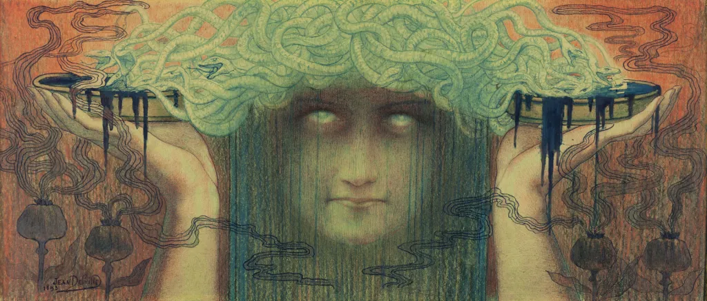 Supporting the suggestion that Symbolists were not wholly out of touch was their response to the “New Woman” movement of the 1890s—albeit with mixed results. Women demanded more, and Symbolists offered them options. A woman could now be an “addict, biblical protagonist, colonial fantasy, prostitute, violent perpetrator, [or] virgin,” as the show wryly observes. Sometimes she could have it all—the drugs, the sex, the mythic title, and the orientalist overtones, as in Jean Delville’s Medusa (1893), this show’s pastiche of a poster child. Marie Laurencin’s sapphic Song of Bilitis (1905), hung here as if in apology for the clichés of her colleagues, is a half-hearted reminder that Symbolist women could be artists, too.