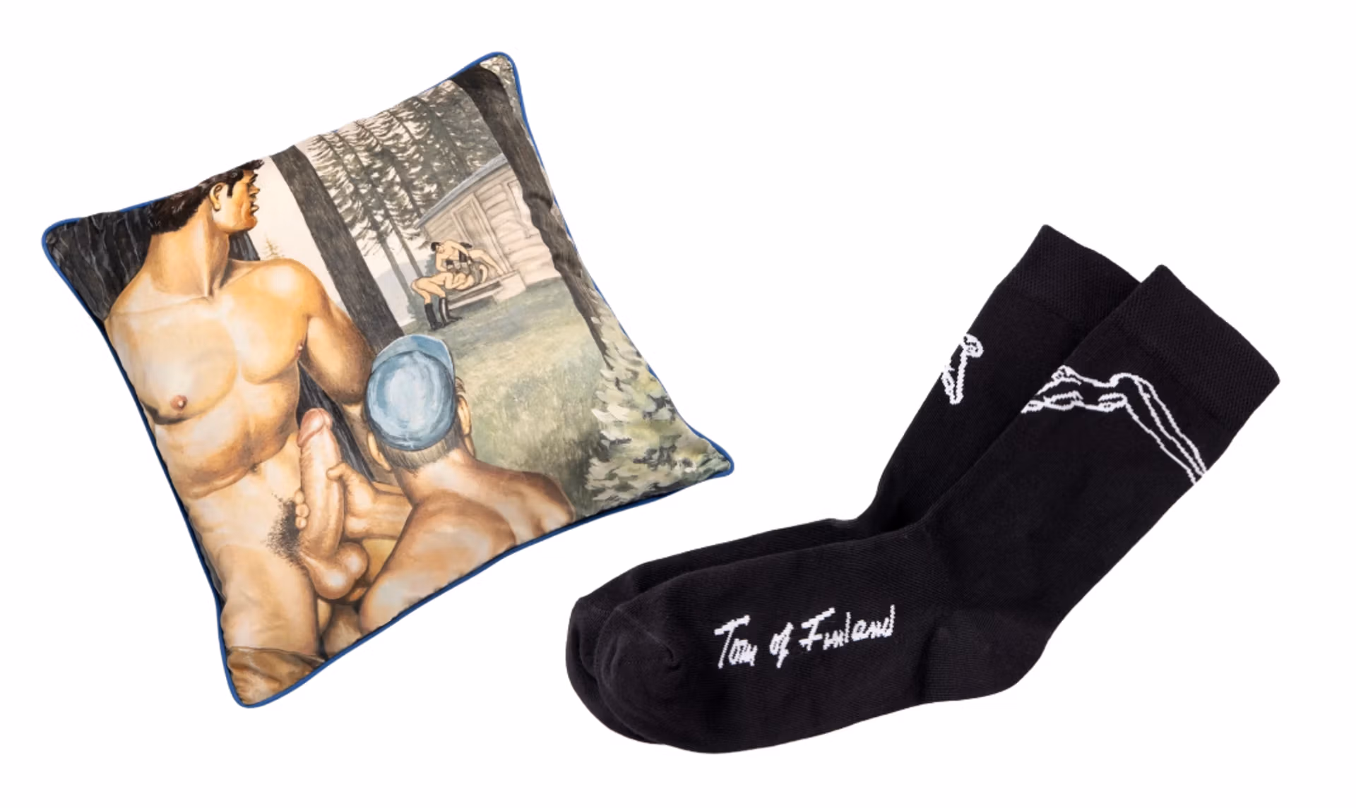 Ooo er… Tom of Finland’s Loggers cushion and sexy socks, exclusive to House of Voltaire Image courtesy of the Tom of Finland Foundation and Studio Voltaire, Photo: Graham Pearson