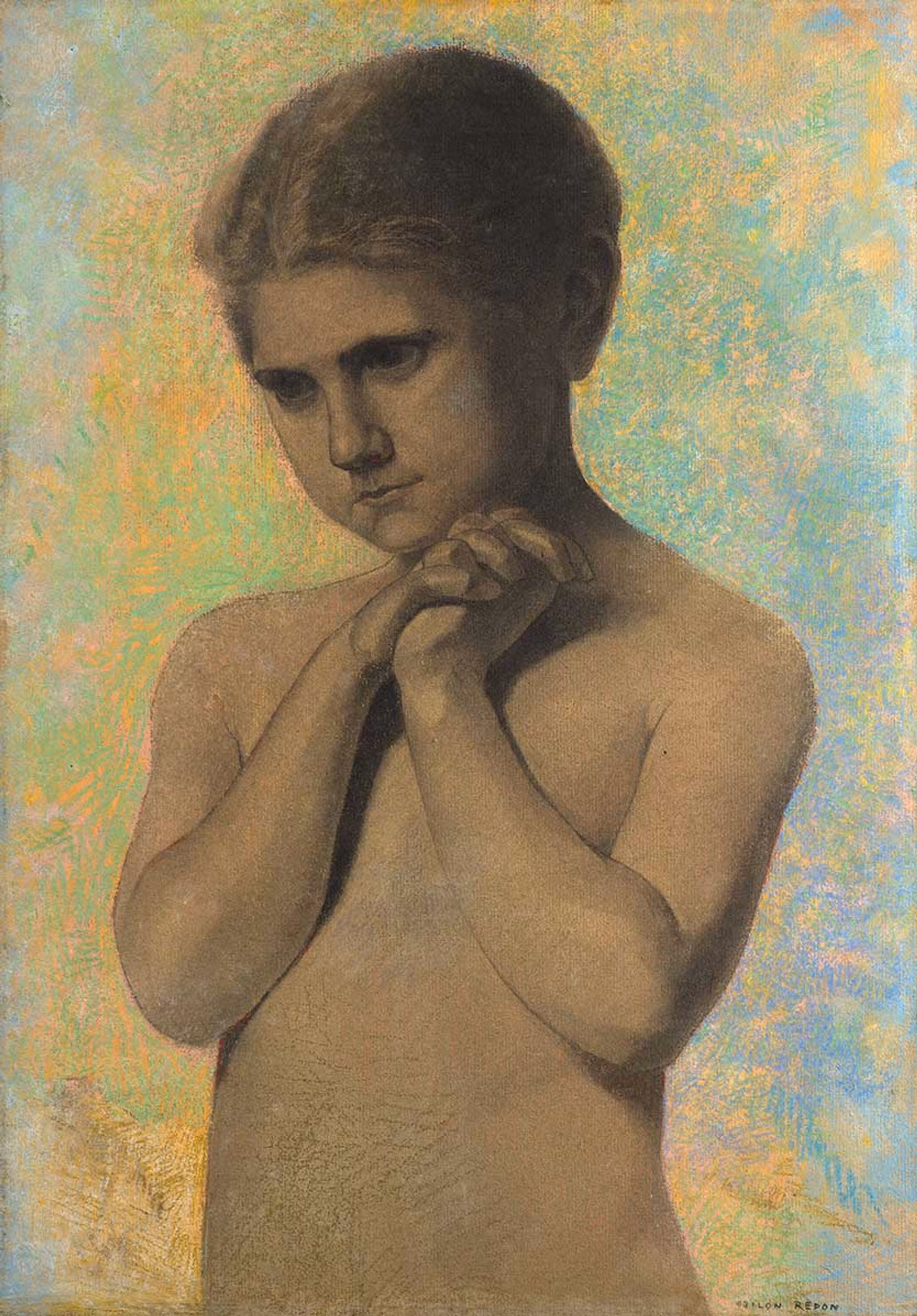 The French Symbolist Odilon Redon is probably best known best for his series of what he called noirs, monochromatic lithographs and drawings of mysterious and nightmarish subject matter, like monsters and other strange creatures. This work on paper stands in sharp contrast with those gloomier subjects; it comes from a later period that when he was using children as subjects to represent innocence and pure emotion.