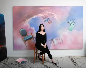 Ariana Papademetropoulos’s latest exhibition, titled “Glass Slipper,” is more than a fairy tale. Currently on view through April 11 at Thaddaeus Ropac’s space in Paris, the show features paintings from two different series—one hyper-realistically depicts dresses in dry cleaning bags, the other chairs floating in different landscapes—as well as an installation consisting of a fish tank and mattress in which visitors are invited to lay on and don some headphones to listen to a commissioned soundtrack. The artist wanted to transform the gallery into a ritualized space, where water, portals, and invisible forces create an immersive encounter. Below, Papademetropoulos describes how she conceived of the exhibition, her various influences, and what she thinks keeps art alive.