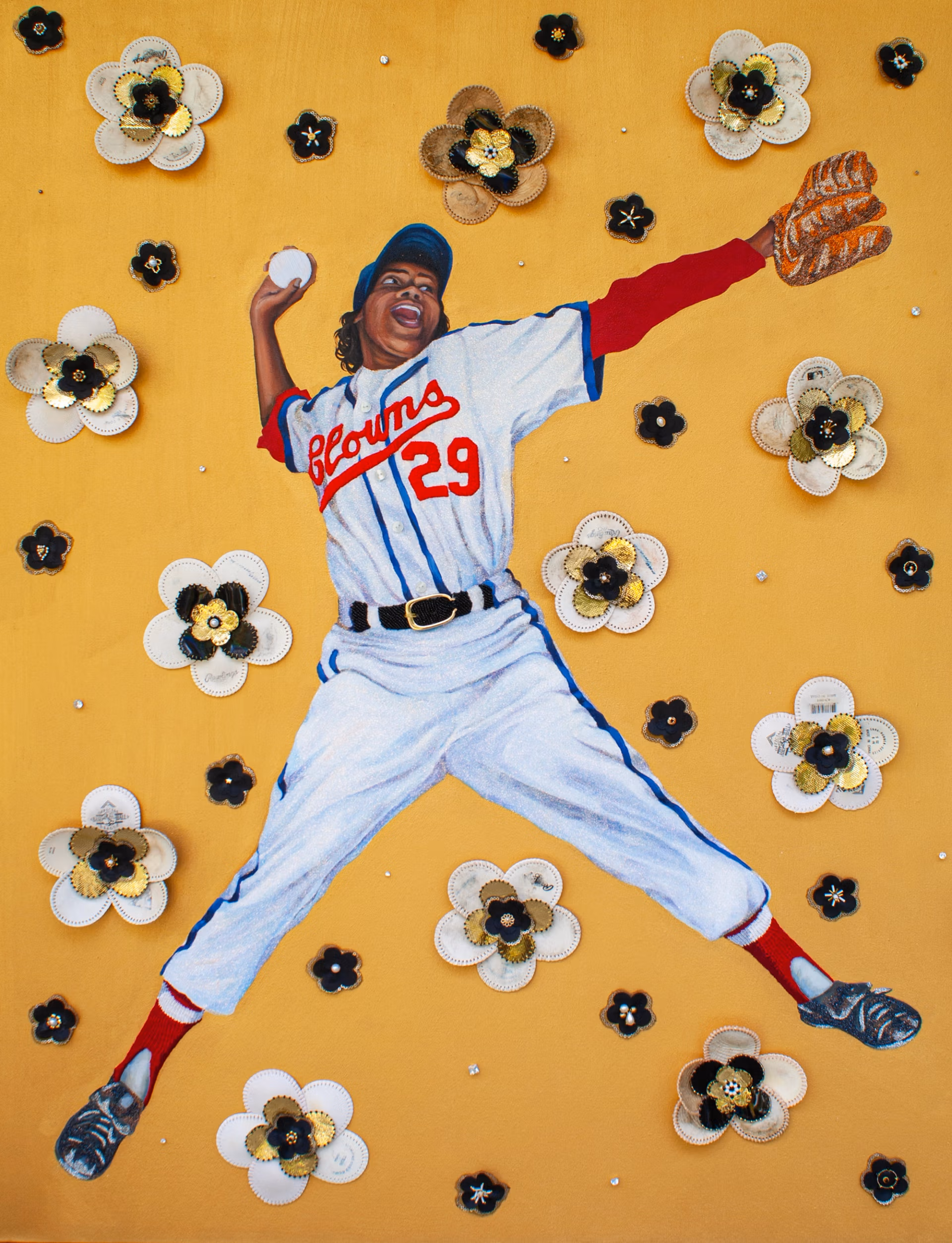 Katrina Majkut’s portrait of baseballer Toni Stone in a “baseball flowers shower” is a home run