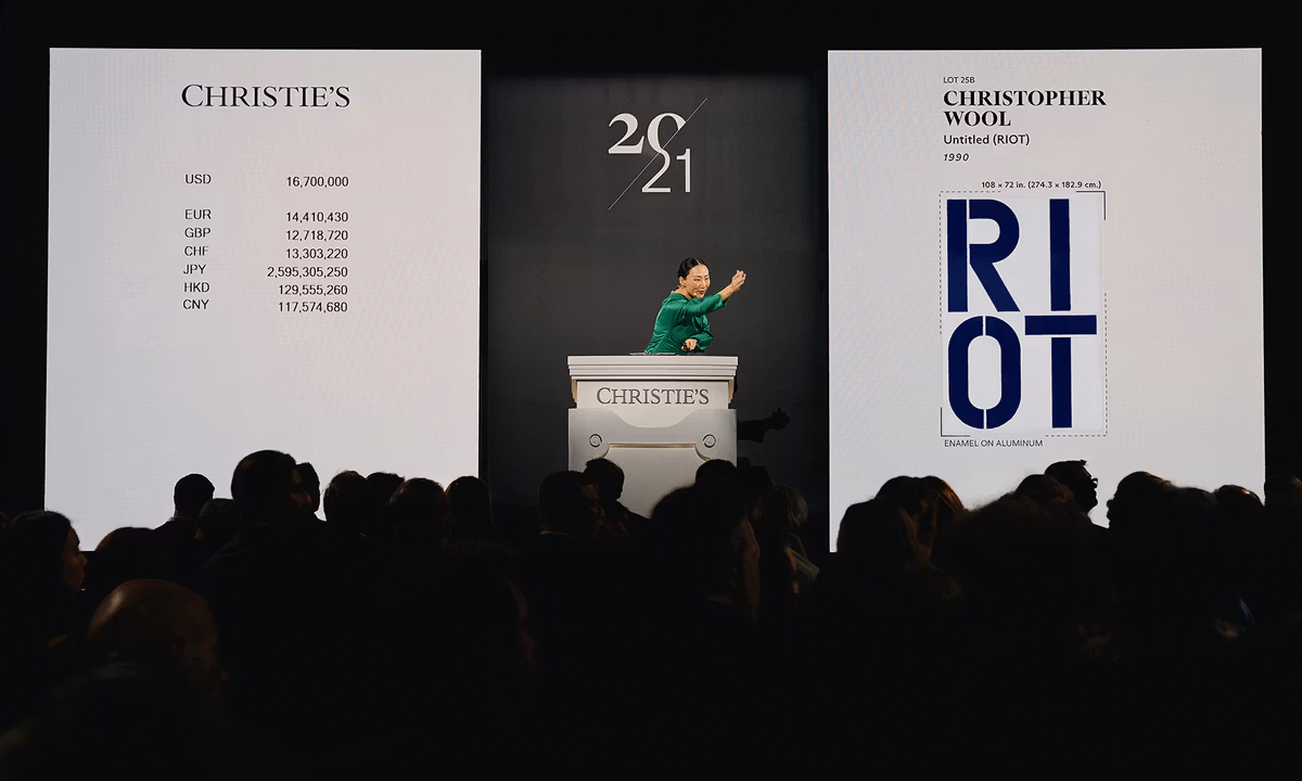 The evening’s top lot was Christopher Wool’s mightily scaled, split word painting “Untitled (RIOT)” from 1990, executed in navy blue enamel on aluminum, which hit $16.7m ($19.8m with fees). It was also backed by a third-party guarantee; this was its first appearance at auction.