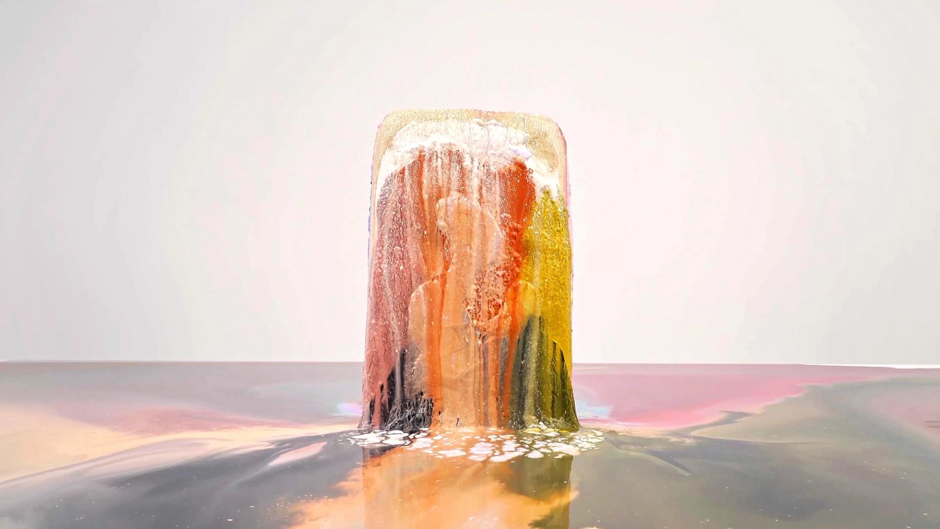 The Earth is an Hourglass (still), (2024), by the Singaporean artist Dawn Ng, is a single-channel video documenting the melting of a pigment-infused block of ice. The work is in the Asia Pacific Triennial and has been acquired by QAGOMA.