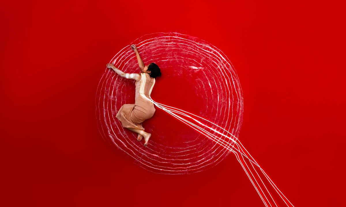 Violent electric shocks contort the body of the Thai artist Kawita Vatanajyankur as she struggles to draw a spiral with white chalk on a red background.