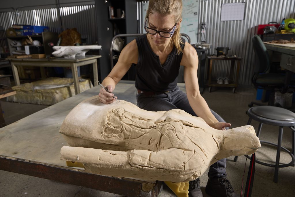 On a recent tour of the foundry, we spotted current artist in residence Lee Running wearing protective gear as she and another worker were removing a bronze sculpture from its sand cast. A few minutes later we were standing in her dedicated work space within the factory as a fork lift driver carefully deposited it there.