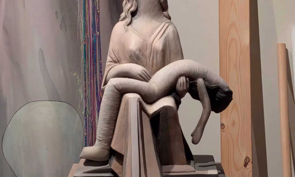 A new work, Strata (2025), fills an entire wall with a glass case bursting with items ranging from female busts to random plaster and fabric limbs. Some of these are tucked between folds of packing blankets, the sediment-like layers of fabric chiming with the work’s geological title as well as echoing Freud’s notion of the unconscious as an archaeological site, excavated through psychoanalysis.
