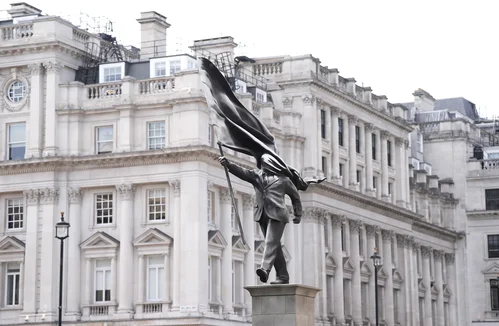 “[Banksy has] pulled off another fantastic coup . . . the positioning is absolutely knockout,” said James Peak, the creator of the BBC podcast series The Banksy Story, in an interview with the BBC. “Here, you’ve got a brilliant comment on a bumptious, chest-puffed-out man in power with the flag completely obscuring his vision, which is why he is about to fall off the plinth. . . . I don’t know how he’s managed to do it.”