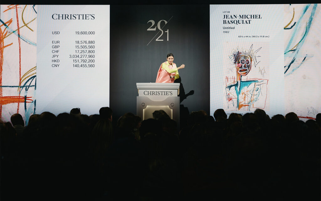 Though it didn’t have the same viral appeal, Christie’s top lot, Jean-Michel Basquiat’s oil stick on paper, Untitled (1982), didn’t disappoint despite going for just under its low estimate. Consigned by top collector Peter Brant, it was estimated to fetch $20 million to $30 million but bidding started far below that: Auctioneer Georgina Hilton opened the action at just $13 million. Several bidders chased it before it hammered for $19.5 million on a bid from mega collector Alberto Mugrabi, known for his deep holdings of Basquiat, who was seated in the front of the auction room. The final price with fees of $22.95 million marked a new high for a work on paper by the artist at auction.