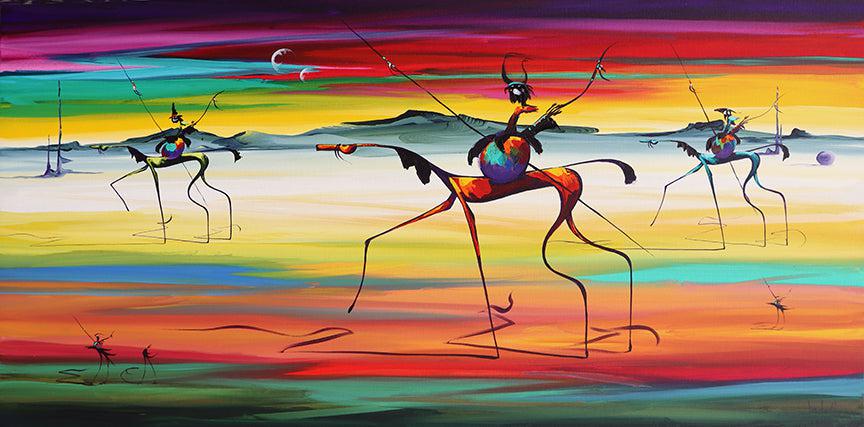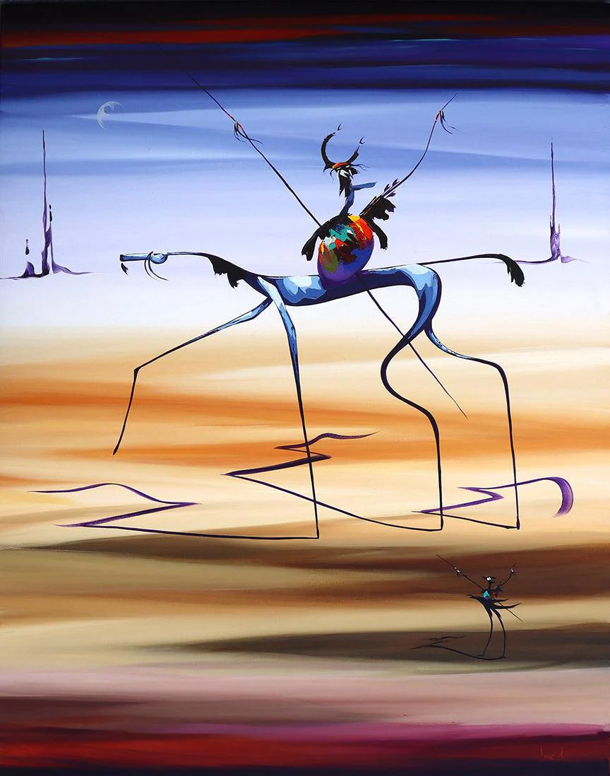 With bold calligraphic brushstrokes and luminous color palettes, these works create visual portals between worlds. While they acknowledge the 20th-century Surrealist movement, they transcend mere homage through Hayes’ distinctive visual language that blends Eastern philosophical concepts with Western artistic traditions.