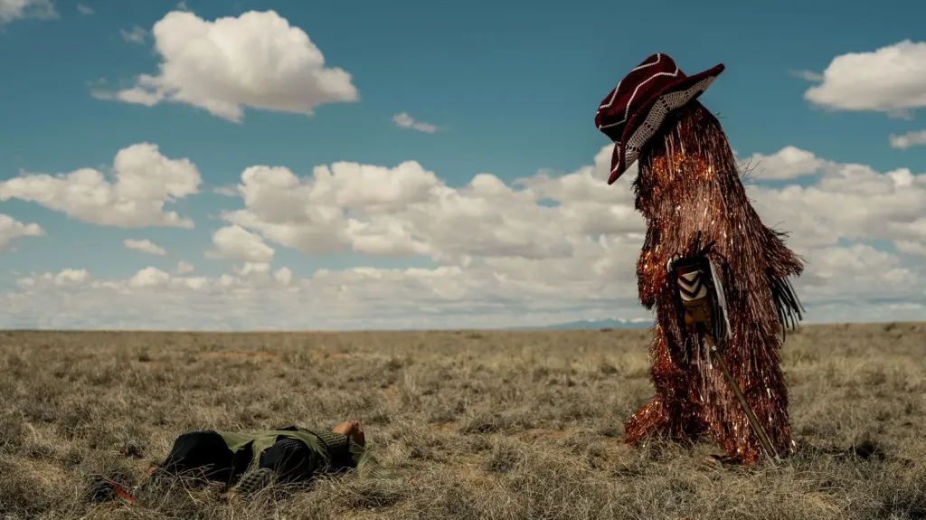 Luger is no stranger to creating unusual costumes or working in the language of film, though his practice typically leans toward Indigenous futurism. His ongoing project Future Ancestral Technologies imagines possible Indigenous futures through short films populated with Indigenous characters dressed in elaborate, futuristic costumes designed by Luger.