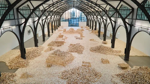 The work transforms the museum’s vast historic hall into a monumental space for collaboration, construction, and contemplation. Spread across the former train hall are 400,000 small wooden cubes, which are stacked neatly in formations or scattered in piles. Visitors are invited to build and dismantle temporary structures with the blocks, while a libretto centered around community, love, loss, and hope carries through the space. The lyrics are based on lines from poems by writers and artists including Lebanese artist Etel Adnan, Vietnamese American poet Ocean Vuong, and Palestinian writer Maḥmūd Darwīsh. A dozen performances activate the space at given times to construct and sing alongside the public as a meditation on the power of a collective force.