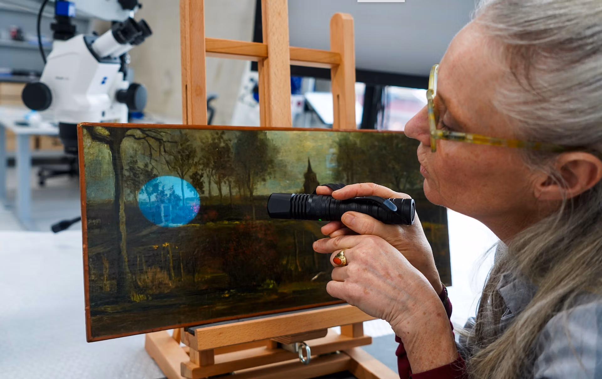 Conservator Marjan de Visser working on The Parsonage Garden at Nuenen in the Spring (March 1884)