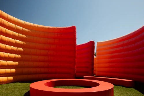 Marcelis’s Maze (2026) is a labyrinth constructed out of inflated, curving arcs. The artist took inspiration from the surrounding Coachella Valley, imagining the maze like a mirage against the desert landscape. The artist and festival organizers will encourage guests to explore the maze, particularly at night, when the installation’s inflatable structures will glow.