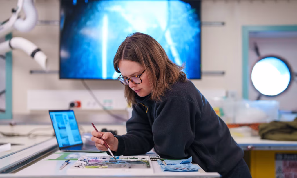 The artist Constance Sartor working aboard the Schmidt Ocean Institute’s research vessel Falkor (too) as part of the Artist-at-Sea programme Courtesy the Schmidt Ocean Institute