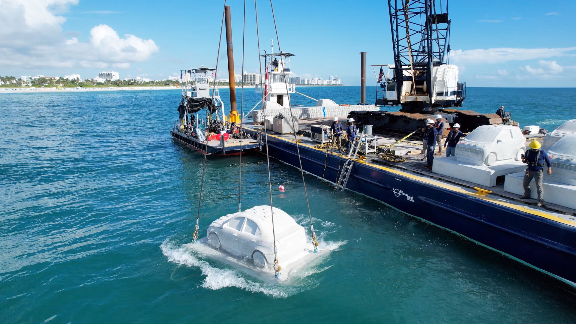 It took a 157ft-long construction barge, heavy-lift cranes and impeccable logistics to submerge Erlich’s 22 cars off the coast of Miami Beach, between 4th and 5th Streets, in late October. Within minutes of being installed, fish began swimming curiously around the cars’ hollow shells.