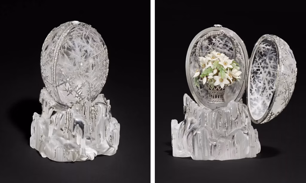 Known as the Winter Egg for its delicate frost and snowflake designs, the ovoid was among around 50 commissioned by Russia’s imperial family between 1885 and the eve of the Russian Revolution in 1917. Seven are believed lost since the Russian Revolution, and only seven remain in private hands.