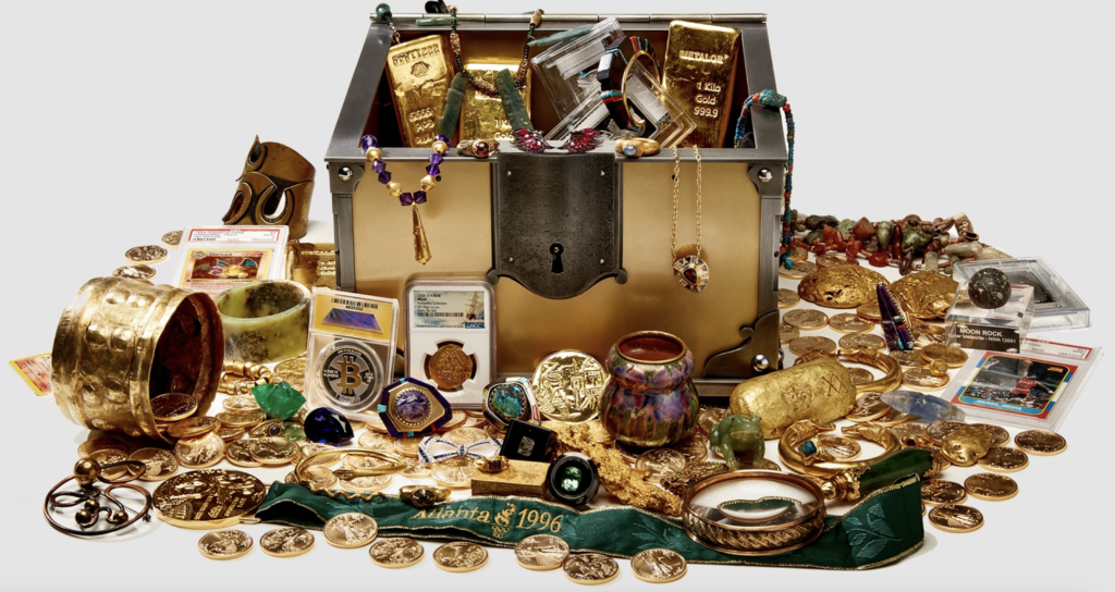 The boxes contain rare and valuable items such as a green Colombian emerald, highly coveted Pokémon cards, a jelly glass owned by America’s first president George Washington, and a Casascius bitcoin – the first physical bitcoin ever to be made. It was his own successes with early bitcoin investing that helped launch Collins-Black into the wealth required to pull off this kind of stunt. Depending on when the treasure is found, the value of the bitcoin (and other items in the treasure including the price of gold) could massively inflate (or deflate) the value of the treasure.