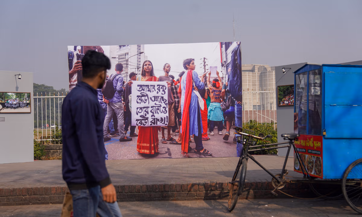 Green-liveried cycle rickshaws and horse-drawn tongas idled outside the parliament of Bangladesh on a night in February. Families and couples from nearby colleges drifted past life-sized photographs of women at the frontlines of a revolution, their bodies contorted with the pain and defiance of political violence. It was the 11th Chobi Mela photography festival, and that bustling stretch of pavement in central Dhaka was hosting the temporary installation Women in the July Uprising: Essential Then—Why Erased Now? In front of the broad area of manicured foliage that surrounds the parliament building, Dhaka’s photography community was posing a troubling question: after a popular revolution, what happens to the people?