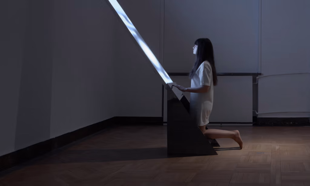 It is not often one finds oneself down on their knees in front of a work of art. But that was the case for many visitors to the recent exhibition Elusive Sense: On the Fluid Boundaries of Perception at London’s ​​art’otel. The exhibition presented five contemporary artists from Poland whose works explored the impact of technology on the senses. Art goers crouched on a leather kneeler at the foot of a monolithic digital screen and used the touchpad in front of them to aimlessly scroll through streams of nonsensical lit up shapes and symbols.