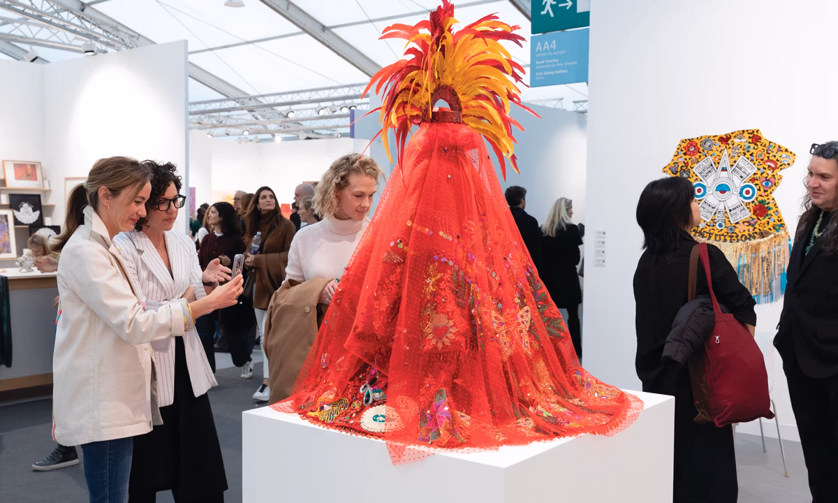 The Mexican American artist René Treviño has been selected by Sherald to take part in Frieze’s Artist-to-Artist section, where leading names pick an emerging artist for a solo presentation. Front and centre in the booth is Regalia, Moscas Brillantes (Rojo) (2025), a sculpture of a figure elaborately gowned in red feathers, appliqué, lace and rhinestones. It is a work that speaks, in part, to “the history of queer resistance in art”, says the gallerist Erin Cluley.