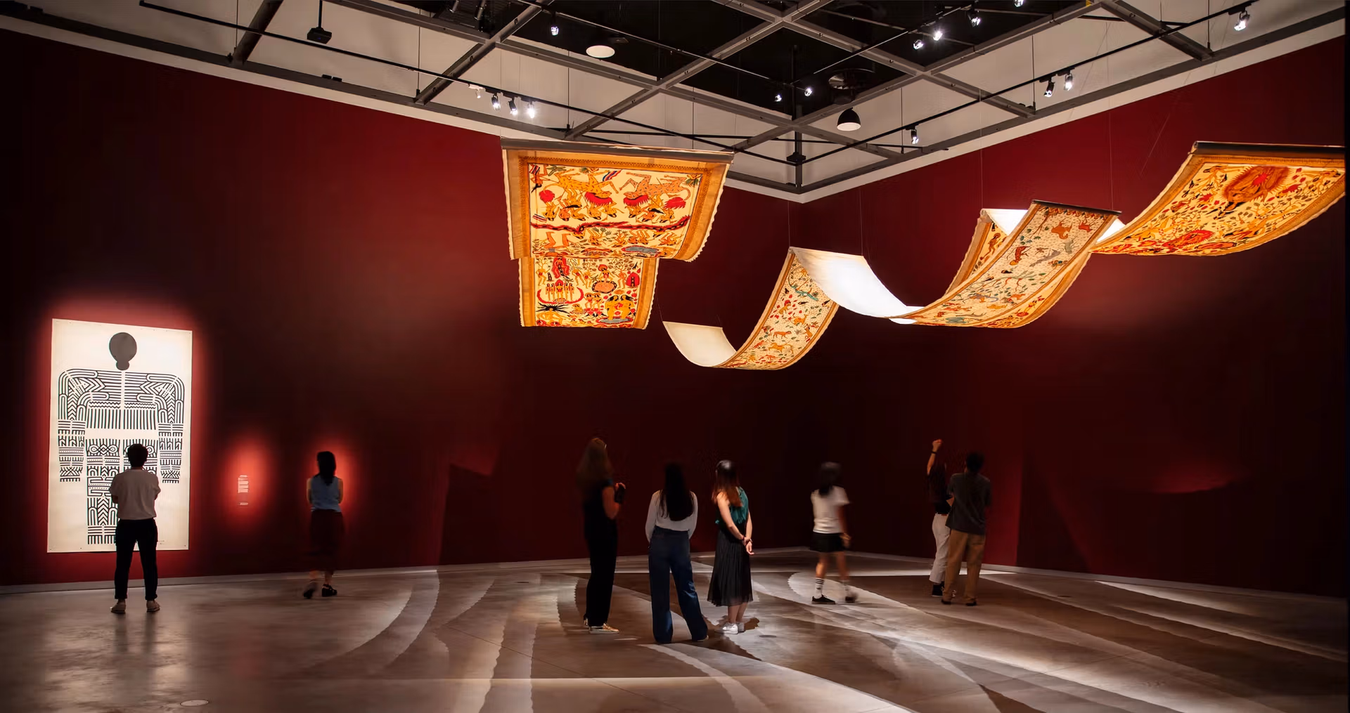 The Balinese artist Citra Sasmita invites viewers to step away from the bustling fair ground and settle onto floor cushions beneath a protective canopy of monumental scroll paintings. Suspended from the ceiling, the scrolls are inspired by Bali’s traditional Kamasan paintings, which illustrate mythological narratives that often focus on male heroism. While women are typically relegated to the margins in these paintings, Sasmita shifts that balance, placing female protagonists at the centre. By portraying them as powerful beings, Sasmita subverts the exoticised image of Balinese women perpetuated in colonial imagery. The installation also features textile works and cowhide paintings inspired by the Pacific Ring of Fire, exploring fire both as a destructive force and one that has the capacity to purify and renew. Seen together, the works in this installation harness the Balinese philosophy of Taksu, a divine spiritual energy, which Sasmita channels to create a feeling of transcendence.